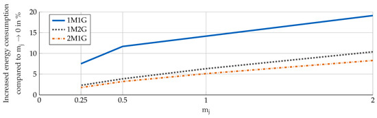 The relative difference in energy consumption compared to for different restrictions on jerk are shown in Figure 6. It can be seen that the energy consumption rises for higher restrictions on jerk. In particular, the 1M1G-topology increases energy consumption if jerk restrictions are rising. However, if no restriction is active, energy consumption of the 1M1G topology is almost as low as the energy consumption of the other topologies (Figure 5). Since the energy consumption for the 1M1G topology is higher if jerk is restricted, the sensitivity on jerk is higher for this topology.