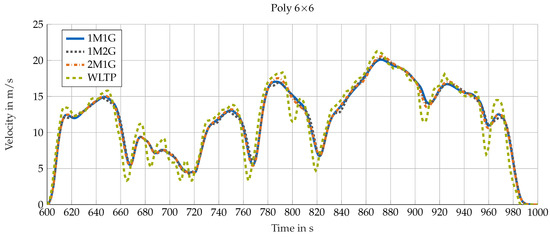 Table 4 summarizes the absolute energy consumption for different powertrain topologies using Poly 1 × 2 and Poly 6 × 6 and the relative difference to the and Poly 1 × 2 minimization of the regarded powertrain topology. To obtain the energy consumption of the minimization, the speed profile is calculated first and then constrained to optimize powertrain operation with the Poly 6 × 6 optimization. The results show that the 1M1G topology is able to reduce the energy consumption by the greatest extent in comparison to the minimization.