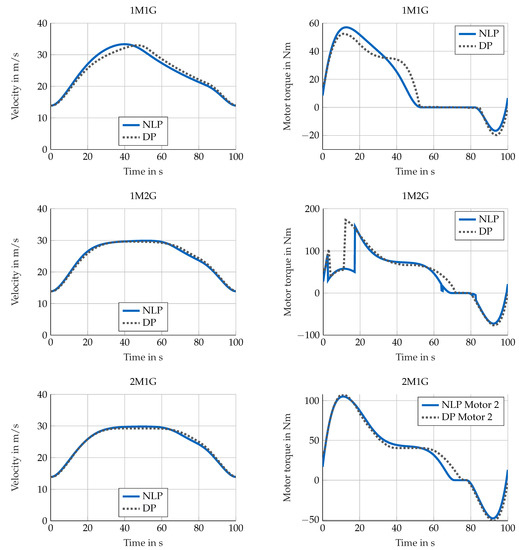 The results of the Poly 6 × 6-NLP are compared to the results of the DP, which calculates the global optimal solution within the discrete solution space. Figure 8 displays the resulting speed profiles of the DP and NLP with Poly 6 × 6 as well as the resulting motor torques for the 1M1G, 1M2G and 2M1G topology, respectively.