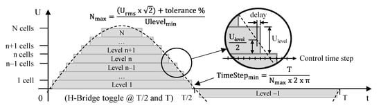 When taking EU electrical network voltage as an example, which is 230 VRMS +/− 10% with a frequency of 50 Hz, and using cells which the specified end of discharge threshold is 2800 mV, Nmax reaches 128 and the related minimum time step is then about 25 µs, which corresponds to an equivalent switching frequency of 40 kHz. This frequency can be reduced if more than one level can be switched at each control time step. Note that the battery pack could include additional cells that could be used to provide the maximum voltage output in case of cell failures; therefore, the number of cells could be greater than Nmax without affecting TimeStepmin.