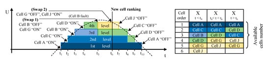 Waveforms generated with our system are similar to those from carrier cascaded PWM, but the management of electrical grid disturbances and cells faults is now possible within a half cycle of the sinusoidal voltage without signal perturbation. A control loop updates the reference waveform in real time, which allows forthwith management of the electrical network voltage perturbations. The first in first out (FIFO) principle is applied to connect and disconnect the cells. The selection of the cell to be connected or disconnected is performed on the fly in a priority order provided by a balancing algorithm. The failing cells are handled forthwith without disturbing the generated waveform by means of a cell swap operation. The priority order of the cell use is given by a ranking X(t), which is updated over the time from the availability of the cells and by the balancing algorithm. As illustrated in Figure 2, the first four levels are connected from time t1 to t4 according to the reference signal. At time t5, a fault occurs on cell B, which is associated with the third level. This faulty cell is disconnected and instantly removed from the list of available cells list in the ranking X(t). This ranking gives cell G as the next available cell to be connected in replacement of the faulty cell. At time t6, the cell ranking X(t) is updated by the balancing algorithm. Cell G, now with rank five, is immediately replaced by cell J that has now rank four. Then cell J is disconnected at t7 when only three levels are required in order to follow the theoretical waveform. At time t8, only two levels are required and cell C is disconnected as requested by the ranking X(t). At time t9, only one level is required and the cell D is disconnected. At time t10, the zero-crossing point of the voltage is reached. The cell A is disconnected and then all cells are bypassed. The negative part of the waveform is generated using the inverter H-bridges distributed on each module containing 4 cells (see Figure 3), while cells are connected successively in the order given by the cell ranking X(t) (cell A first). The following sections show how the CEA has implemented the innovations presented above.