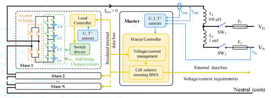 We propose to exploit the concept of distributing switches and their physical drivers over the battery pack while maintaining centralized control of the overall cell layout and monitoring. For this purpose, the SRB is divided into remote modules named “slaves” and a central module named “master.” As argued in Section 3.4, each slave is composed of four cells connected in series through half-bridge chopper circuits, an H-bridge to reverse the polarity of the module and a local controller. Then slaves are chained to reach the required output voltage. An overview of the overall hardware architecture is given in Figure 3. Vout is the output-to-com voltage of the HF SRB, VN is the line-to-neutral voltage into which the AC charger voltage comes in and VG is the generated AC voltage for the battery discharging.