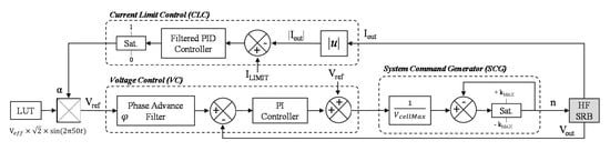 The output of each of them has a system command generator (SCG) bloc (Figure 6) to convert a voltage command into the number of levels in series (n) to be activated at the output of the HF SRB. kMAX is the maximum number of series cells that the system can be applied to at the same time (cells added if positive and cells removed if negative) and VcellMax is the maximum voltage of one cell (4.2V for NMC Lithium battery). The discharge control system (DCS) includes two sub-control loops: a current limit control (CLC) to ensure that Iout amplitude never exceeds ILIMIT, and a voltage control (VC) to ensure that Vout follows Vref. The target AC voltage data points, which are obtained by sampling a 230VAC-50 Hz sinusoidal signal at 20 kHz, are stored in a look-up-table (LUT). The latter is then multiplied by a factor α to produce Vref with 0 ≤ α ≤ 1. α is decreased by CLC to lower Vout when the output current Iout is too high.