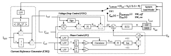 Finally, the VDC bloc controls the differential voltage ∆V between VN and Vout to keep Iout^* close to iref. To obtain ∆V, the control loop estimates the equivalent resistor Req between batteries and the AC charger that includes batteries ESR, inductors internal resistance, wire resistance and so on. In practice, VN is not directly connected to Vout at the start-up of the control system to avoid short-circuiting and damaging the charger and the HF SRB system. The solution is to synchronize VN and Vout when Iout = 0 A (SW1 off) and to make VN’s amplitude slightly higher than Vout’s one to allow current flows from AC charger to HF SRB after switching on SW1. To do this, Iout^* is first equal to the modelled current IoutModel until |∅adv| < 0.01—the necessary condition to switch on the power relay SW1—and then uses Iout as a feedback input current.