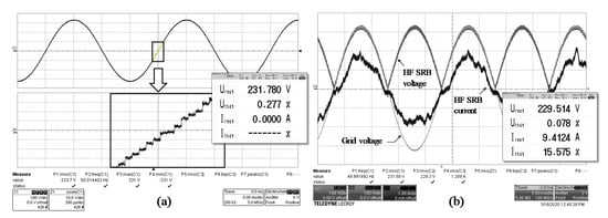 HF SRB 230Vac 50Hz experimental waveforms discharging on a resistive load (a) and direct charging on the electrical grid at 280 Wrms (b).