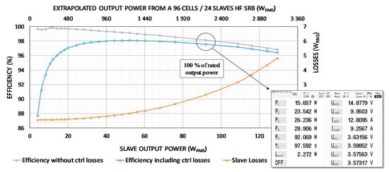 The efficiency curve of one slave is also depicted in Figure 10. To extrapolate the efficiency of the HF SRB charging over the electrical network, we multiply the powers on x-axis by the number of slaves required to generate a sine waveform of 230 VRMS (hence a factor of 24 for cells at rated voltage of 3.6 V). The efficiency of the HF SRB is also depicted after subtracting the consumption of the control electronics (24 times 580 mW), as is typical in efficiency measurements carried out on power converters. It can be seen that the efficiency of the HF SRB is above 98% up to 2300 WRMS of power delivery, which corresponds to a discharge rate of 4.5 C. These results are among the best of the state of the art [23].