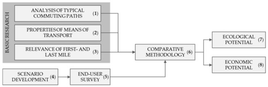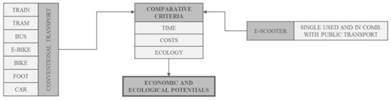 Thus, this study focused on routes to work within the German market. As commuters mostly travel highly optimized routes, any improvements are beneficial. Furthermore, because work paths are already predefined, users were able to provide detailed information in the conducted survey. The overarching research interest lies in the comparison of the use of e-scooters and other means of transport on typical commuting paths. The methodical approach consisted, firstly, of a literature search to identify properties of commutes, means of transport, and the first and last mile. Secondly, the user’s preferences for e-scooters were detected via a survey, which included different mobility scenarios. These data were collated and evaluated in a comparative methodology, in which the ecological and economic potential of e-scooters was derived. The methodology of this study is presented in detail in the following section, followed by the compilation of the state-of-the-art research within this field. Section 3 focusses on the results of the evaluated datasets, the conducted end-user survey, and the executed calculations. In Section 4, the results are summarized and the key findings are highlighted. This paper is based on [4] and shows extended results.