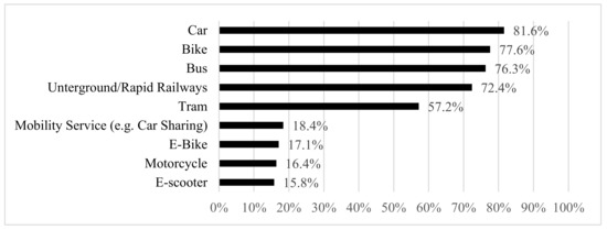 In the context of this study, 152 people were surveyed in total, 120 online and 32 personally. The share of male participants was 73.0% (111 people) and that of female participants was 26.3% (40 people). One respondent chose the sex “diverse” (0.7%). A sample size of one was not considered further for gender-specific evaluations. As described above, the aim of the survey was to interview people with and without experience with e-scooters and comparable vehicles, to obtain an overview of opinions and estimate their potential as a commuting vehicle. Therefore, the survey was conducted at the “micromobility-expo” fair in Hannover, Germany (3–4 May 2019), and online (10–24 May 2019). In total, 50.7% (77 people) did not have experience with e-scooters, 27.6% (42 people) had tested one, and 21.7% (33 people) either owned a PLEV or used one regularly (e.g., in sharing systems). Figure 3 presents the means of transport that that respondents have access to. The means of transport with the greatest access is the, car at 81.6% (Figure 3), followed closely by bike (77.6%), bus (76.3%), and train (72.4%). As underground and rapid railways are only available in cities, their share (57.2%) was smaller than those of other public means of transport. Additional modes, such as Mobility as a Service (MaaS), e-bikes, or motorbikes were used by less than 20% of the respondents. A share of 15.8% (24 people) owned or had access to a personal light electric vehicle.