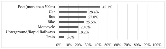 Subsequently, participants were asked if they could imagine replacing a means of transport of their commute with a personal light electric vehicle. Slightly more than half of the respondents (53.9%) could not. Another 5.9% already used an e-scooter on their commute. The remaining 40.2% of interviewees could potentially imagine using an e-scooter. Figure 5 demonstrates the share of potential users of PLEVs within the different means of transport. A share of 42.1% of people walking more than 500 m during their commute would cover this distance with a PLEV. In the case of motorized individual transport, 28.4% would substitute their car with a PLEV and 20.0% would do so with their motorbike/motor scooter. In public transport, the share was almost as high: 27.8% of bus users and 18.2% of underground/rapid railway users were interested in PLEVs. As PLEVs are generally used for short distances, only 5.6% of train users would replace their current means of transport with e-scooters. The respondents also viewed PLEVs as a substitute for bikes: one-quarter of cyclists were interested in switching modes. Therefore, an ecological assessment is difficult because respondents indicated both motorized traffic and trips by bike and foot could be replaced by PLEVs, contradicting the hopes and expectations for this new means of transport.