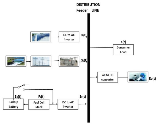 The proposed model is on an AC bus that has multiple sources to overcome the transients and regulated output. The system model constitutes of DERs i.e., PV system and PEM, interfaced with the AC feeder line by DC to AC inverters having maximum power point tracking (MPPT) for specified output voltage. Figure 2 depicts the line diagram of the proposed system. The PV system has multiple series-to-parallel modules while the fuel cell has multiple stacks as per generation capacity. PEMFC has a backup battery as its operations are continuous and can save energy during off-peak hours. The inverter voltage parameter is set according to AC line voltage so these sustainable sources can be synchronized with the grid. The inverter is designed by the IGBT for the application of buck converter, controlled to have constant value at the output. The hydroelectric energy source is also continually feeding to the line by the transformer. PEMFC which has boosted output has fed to the AC line by inverter. The fuel cell is fueled by the hydrogen having electrolyte for production of hydrogen at anode end, so after the reaction water is collected as waste at the cathode.