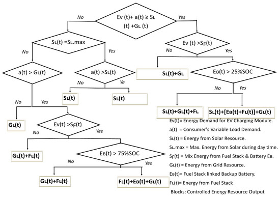 Figure 3 shows the algorithm of the proposed ERM system where conditions have been idealized as system demand for each case of ERM. The priority is given to the PEMFC for high current so the probability of ERM for PEMFC is in a higher range to overcome current ramp conditions of the system. For system stability, priority is given to the grid source to overcome the harmonics and fluctuations in the output. The solar source dependence priority will be given in the caseload to be greater than the grid so in the overall condition of ERM, Ev(t) + a(t) > SL(t) + GL(t), the solar source is incorporated with the grid source as solar is more economical energy source than others. Solar energy resource has its maximum consumption during daytime when SL(t) = SLmax. The minimum source priority is given to the backup battery as it will be used under its state of charge (SOC) condition. The electrical vehicle module will be a constant load for the system with the variable load of the consumer.