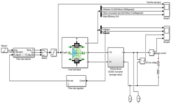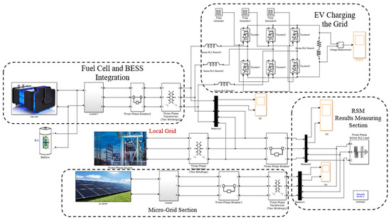 The proposed ERM system shown by the line diagram in Section 3 is implemented and simulated in MATLAB/SIMULINK environment as shown in Figure 4. It can be observed that PEMFC with battery energy storage system (BESS) or battery stack, ECVs system, and micro-grid is integrated into the local grid. Resource Side Management (RSM) is named for the measurement and results in the analysis section of the ERM system. Further aspects relating to the mathematical modeling of the system are discussed in Section 5.