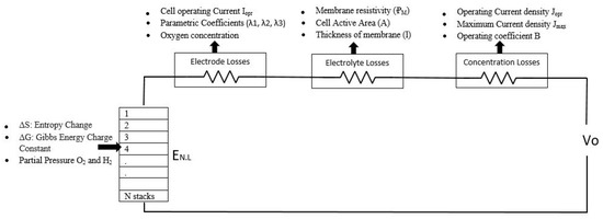 PEMFC uses hydrogen as fuel, decomposes hydrogen into protons and electrons at the catalytic layer adjacent to the anode. The oxidant oxygen is accumulated at the cathode catalytic layer, reacts with the hydrogen protons to form water with residual heat too. PEMFC model has a stack of fuel cells with the losses including electrode losses, electrolyte losses, and concentration losses and the circuit model is shown in Figure 5.