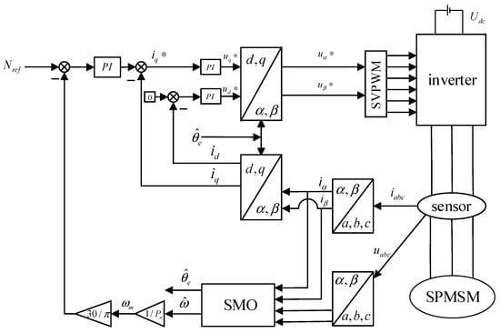Block diagram of sensor-less control of the surface mounted permanent magnet synchronous motor based on improved SMO.