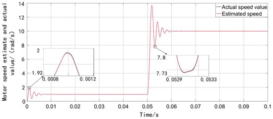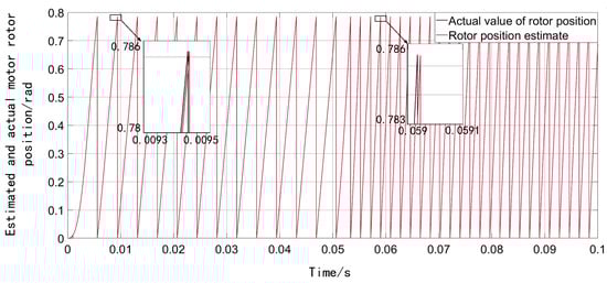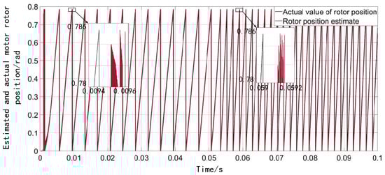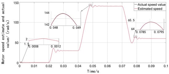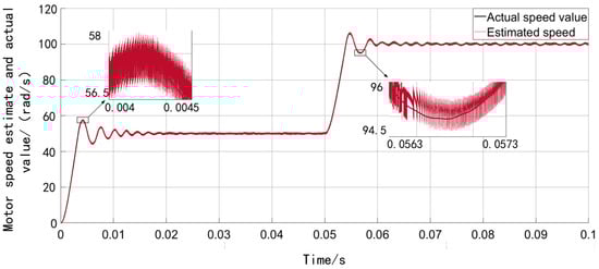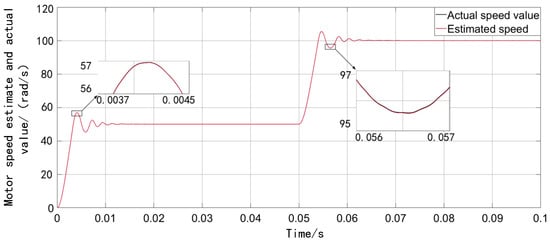 Figure 9 and Figure 10 show the curve comparison diagrams of the actual and estimated values of the motor speed and rotor position of the new and improved SMO, respectively. First, the motor speed is set to 50 rad/s, and the speed suddenly changes to 100 rad/s at 0.05 s.