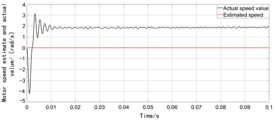 The actual value of the motor speed and rotor position is represented by a black curve, and the estimated value is represented by a red curve. Figure 2 and Figure 3 are the curve comparisons of the actual and estimated values of the motor speed and rotor position of the traditional SMO respectively. First, the motor speed is set at 50 rad/s, and the speed suddenly changes to 100 rad/s at 0.05 s.