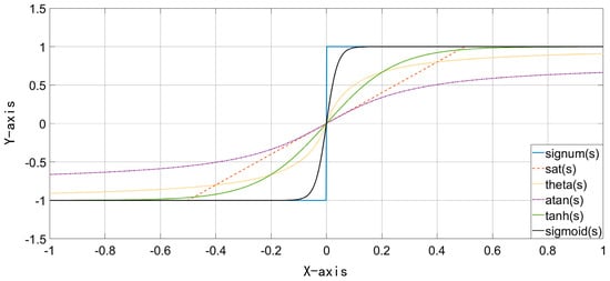 It can be seen from Figure 5 that the value of the blue curve (sign function) changes from −1 to 1 at the zero-crossing point. The sudden change of this function makes the whole system appear as high-frequency chattering. To improve this problem, a function that is excessively smoother at the zero point should be selected, while the convergence rate characteristics of the function should also be considered. Based on the above considerations and the results in Figure 5, this paper utilizes a continuous, smooth and dynamically variable sigmoid(s) to replace the symbolic function in the traditional synovial control strategy.