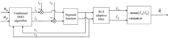 The improved SMO control strategy based on the sigmoid function and the RLS adaptive filter reduces the chattering phenomenon of the switching function in the transition phase compared to the traditional SMO control strategy. Meanwhile, the adaptive filtering method improves the extraction accuracy of the back-EMF signal. The problems such as high-frequency chattering, phase delay, and difficulty in extracting fundamental signals at low speeds have been significantly alleviated. The block diagram of the improved SMO algorithm is shown in Figure 8.