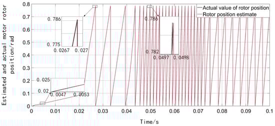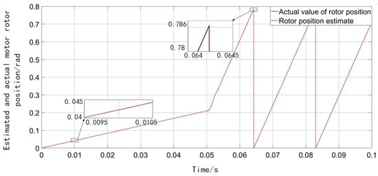 To observe the phenomenon that the motor continuously changes the speed during the driving process of an electric vehicle, Figure 19 and Figure 20 compare the actual and estimated values of the motor speed and rotor position of the new and improved SMO when the system is running at full speed (the red curve is the estimated value, and the black curve is the actual value). First, the given motor speed is 1 rad/s, then the speed changes to 30 rad/s at 0.02 s, the speed changes to 140 rad/s at 0.04 s, and the speed changes to 60 rad/s at 0.07 s.