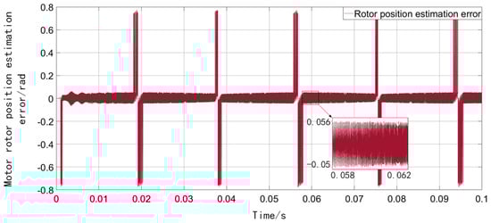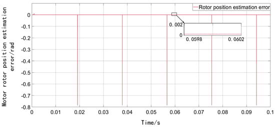 Comparing Figure 15 with Figure 16, it can be seen intuitively that the rotor position estimation error of the traditional SMO is about ±0.05 rad, and the rotor position estimation error of the new improved SMO is about 0.0005 rad. This proves that the new improved SMO is optimized for the estimation accuracy of the motor rotor position.