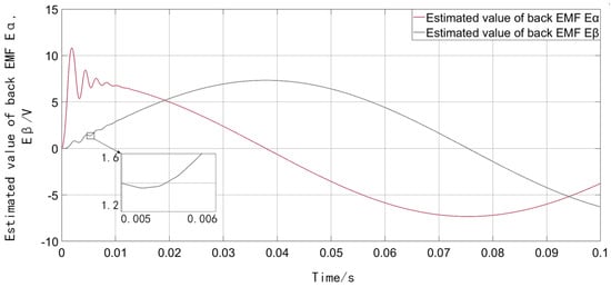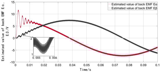 Figure 17 and Figure 18 show the variation curves of the estimated values of the opposite electromotive force of the motor under the low-speed operating conditions of the traditional SMO and the new improved SMO (the red curve is and the black curve is ). The motor speed is set to 10 rad/s.