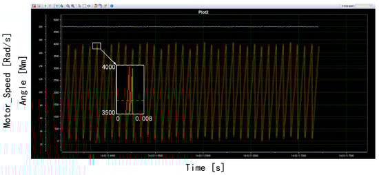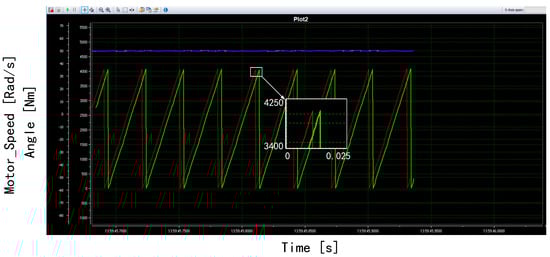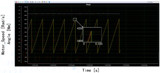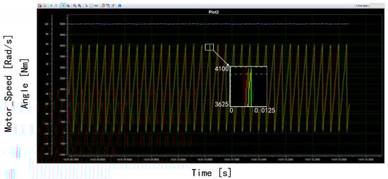 Comparing the yellow and blue curves in Figure 25, it can be concluded that the new and improved SMO observer has a higher estimation accuracy for the motor speed. Comparing the green and red curves, the new and improved SMO observer also has better estimation accuracy for the estimation of the motor rotor position. Comparing Figure 22, Figure 23, Figure 24 and Figure 25, when the motor is at 200 rad/s, the rotor position angle of the motor is missing. This is because the CAN transmission cycle is slow when the motor speed is high, and the transmitted angle is intermittent.