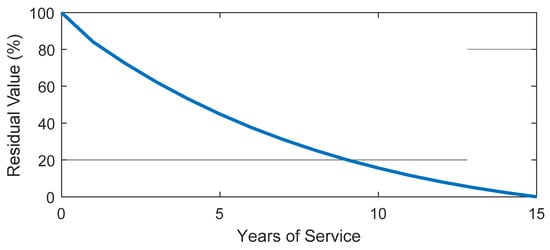 Figure 1. Variation of assumed residual value of a truck as a percentage of purchase price as a function of the years of service.