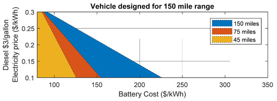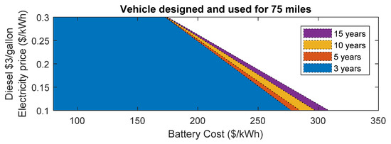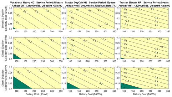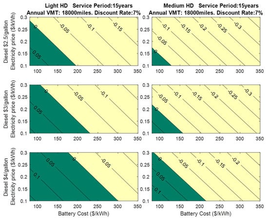 Since predicting future fuel cost is difficult, BEVs economic viability is examined for a range of diesel and electricity prices. Diesel cost varies from $2.5/gallon to $4/gallon while electricity cost varies from 10 c/kWh to 30 c/kWh. When combined with the different battery prices, we can determine under which conditions BEVs will become economically attractive.