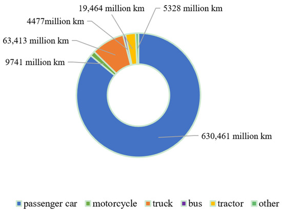 More than 58 million vehicles are registered in Germany, of which 46 million are passenger cars (2017) [18]. Comparing the importance of vehicles according to their mileage, the share of passenger cars with 630,481 million km covers almost 90% of the total annual mileage on German roads [19], as shown in Figure 1.
