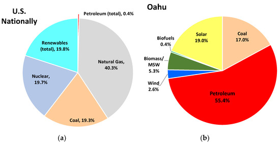 Like many remote communities, Hawaii relies on imported oil for both transportation and electric power in contrast to the rest of the U.S., where less than 1% of electric power is generated from burning oil [2] (Figure 1a). By comparison, on the island of Oahu, Hawaii, 55.4% of the electricity was generated from oil in 2020 [3,4] (Figure 1b). The remaining balance was generated from coal (17%) and renewables (27%). Renewables include solar PV (central and distributed, including residential rooftop), biomass and municipal solid waste (MSW, i.e., waste-to-energy), wind, and biofuel.