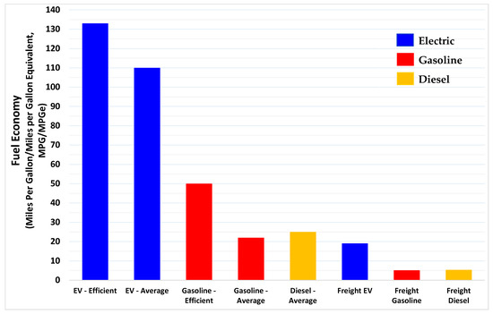 To assess freight vehicles, the most recent data for average fuel economy of medium- and heavy-duty gasoline and diesel freight vehicles [18] were compared with the average medium- and heavy-duty electric freight vehicles [19,20,21,22]. From the U.S. DOE’s Alternative Fuels Data Center (AFDC) (2016 data) [18], the average fuel economy of gasoline freight vehicles is 5.1 MPG, and the average for diesel is 5.3 MPG (Figure 2). A range of electric freight vehicles are being demonstrated and commercially deployed, ranging from delivery trucks to transit buses to refuse trucks. For this assessment, medium- and heavy-duty electric freight vehicles ranging from 0.5 to 3.2 kWh/mile [22] were considered for an average of 1.85 kWh/mile.
