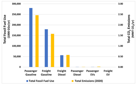 To quantify the impact of all vehicles on the road, fossil fuel use and emissions for each vehicle and fuel type were multiplied by the total numbers on Oahu at the end of 2020. Passenger vehicles comprise the largest share of all vehicles registered on Oahu (93%), far outnumbering freight vehicles (7%) [38]. Although only 1.7% of all passenger vehicles were electric by the end of 2020, the number of EVs increased by 45% in 2020 while the total number of passenger vehicles decreased by 2%. The number of electric freight vehicles was small but increased 57% in 2020, while the overall number of freight vehicles decreased by 1.5%.