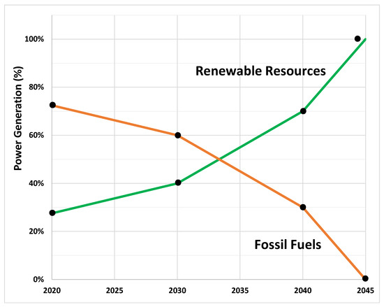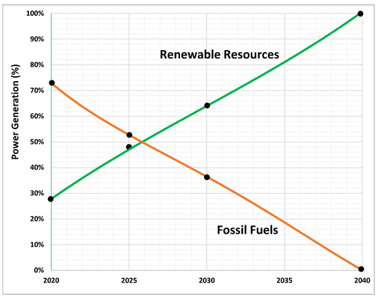 State mandated RPS goals for renewable power generation to 2045 were also plotted (Figure 6, where black markers show the data points) to represent a slower, more moderate projection. Under the RPS projection, renewable power generation exceeds fossil fuels after approximately 2033 in this case (seven years later than the utility’s projection) and 100% renewable power is achieved by 2045, rather than 2040. Once 100% renewable power is achieved in 2045, it is assumed to remain steady thereafter.