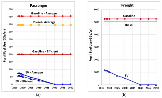 Cumulative vehicle fossil fuel use from 2020 to 2050 on Oahu under the faster renewable power projection: (a) Passenger; (b) Freight.