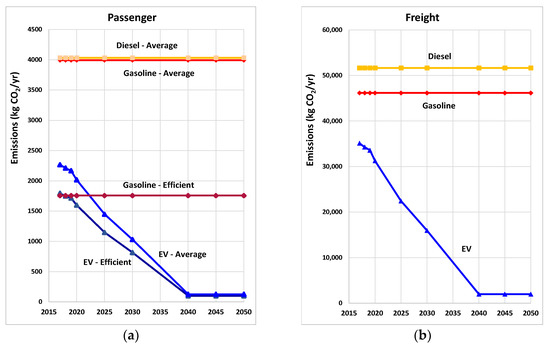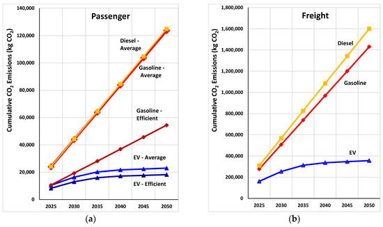 Cumulative vehicle CO2 emissions from 2020 through 2050 on Oahu in the faster renewable power projection: (a) Passenger; (b) Freight.