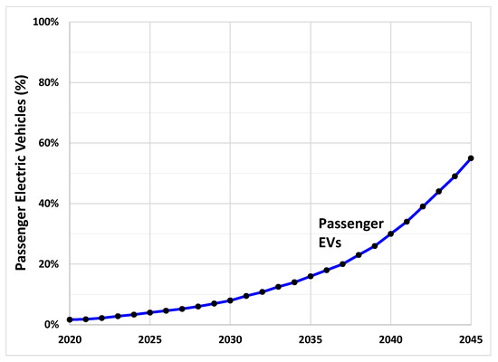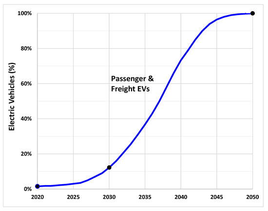 EV adoption is based on two projections, one from a global projection for the faster transition in this study, and the other from a slower, more moderate projection. For the faster EV transition, the modeled EV adoption results (passenger and freight) are based on a recent global EV projection for 12.25% EVs on the road by 2030 [37]. Oahu’s current EV percentages were used as a starting point and 100% EVs was assumed by 2050. A four-parameter polynomial equation was found to be the closest fit (Figure 11, where black markers show the data points used to generate the curve). Using this global EV projection, by 2035, EVs will have replaced 37% of ICE vehicles. By 2040, when the projected renewable power on the grid reaches 100%, EVs will have replaced 73% of ICE vehicles.