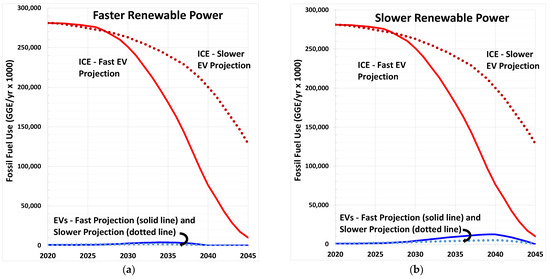 Total Passenger vehicle fossil fuel use showing the impact of the faster EV projection (solid lines), and slower EV projection (dotted lines): (a) Fast renewable power projection; (b) Slower renewable power projection.