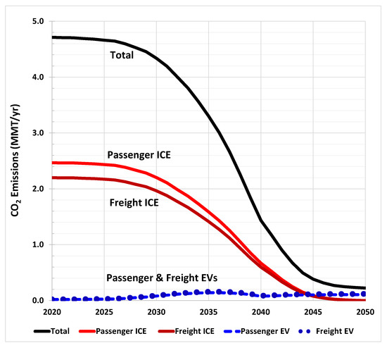 Total CO2 emissions for passenger and freight vehicles powered on Oahu under the ambitious scenario in this analysis, Scenario #1, with the faster renewable power and EV projections (in million of metric tons per year, MMT/yr).