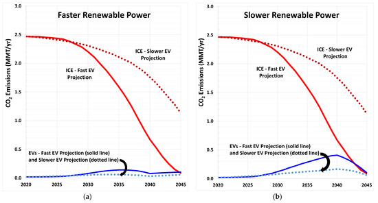 Total passenger vehicle CO2 emissions showing the impact of the faster EV projection (solid lines), and slower EV projection (dotted lines): (a) Faster renewable power projection; (b) Slower renewable power projection.