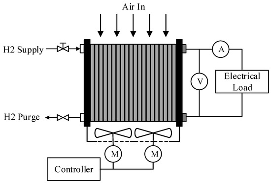 Due to the advantages of zero emission, low operating temperature, high efficiency and high energy density, the proton exchange membrane fuel cell (PEMFC) has been recognized as a promising clean power source [1,2,3]. The open-cathode PEM fuel cell (OC-PEMFC) is a type of PEMFC which is characterized by an open cathode flow channel and air fans at the cathode [4]. The schematic diagram of OC-PEMFC is shown in Figure 1. Without auxiliary parts such as an air compressor, humidifier, radiator and water pump, OC-PEMFC consumes less accessory power, which leads to higher operation efficiency [5]. With a simple auxiliary system and low cost, OC-PEMFC is suitable for applications with lower power demand, such as unmanned aerial vehicles, small portable devices and back-up power sources [6,7,8].