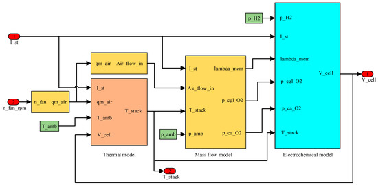 The model used was developed based on mass conservation law, energy conservation law, mass transport theory and electrochemistry principles, also utilizing the electrochemical model, mass flow model and thermal model. In Simulink® environment, the model of OC-PEMFC is established, as shown in Figure 2. In the electrochemical model, the cell output voltage is determined by the Nernst potential and three major voltage losses (activation overvoltage, ohmic overvoltage and concentration overvoltage). In the thermal model, heat generated through electrochemical reaction and dissipation caused by forced convection is considered. In the mass flow model, the air delivery system, the anode flow channel, the cathode flow channel, the cathode gas diffusion layer (CGL), the cathode catalyst layer and the membrane is modelled. Due to the cathode flow channel being exposed to atmosphere, the water retention property of CGL is needed to be modelled, in order to describe the internal humidity state.