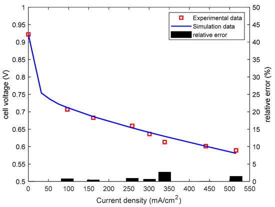where is the relative error between the simulation and experimental data [%], is the output cell voltage of simulation, is the output cell voltage of experiment.