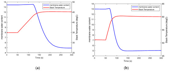 Based on this model, the output performance of OC-PEMFC considering the effect of the internal humidity state is predicted. The simulation results show the dynamic process of the membrane humidity state in response to the current step tests. The settling time of the internal humidity under such current step tests is shown in Table 1. The reasons for the drop in membrane water content, with the increase of current, is the increase of electro-osmotic drag and the rise of the stack temperature. The increase of the water diffusion coefficient in the membrane leads to a slight rise in membrane water content, as shown in Figure 5. Within a certain range of operation temperature, the stack is in a good internal humidity state. However, when the stack temperature rises too high, dehydration of the proton exchange membrane occurs. In order to maintain a good internal humidity state during operation, this model can be used to determine the optimal stack temperature and for the design of a proper control strategy.