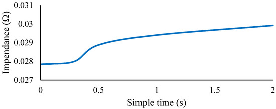 where Rζ,k is the battery dynamic impedance. , , , are the battery measured voltages and current at k and k − 1, respectively. Figure 2 is the result of battery impedance obtained from the relevant experiments at different sampling intervals, taking SOC = 0.5. As shown in Figure 2, when the time interval is between 0 and 0.3 s, the impedance changes gently, but after 0.3 s, the impedance changes sharply. The result declares that the short sampling interval can reduce the influence of current on the calculation result of dynamic impedance. The sampling interval adopted in this paper is 0.1 s.