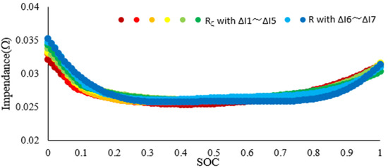 In order to find out the relationship between the dynamic impedance and battery operating current, a set of experiments with different currents at discharge is designed, as shown in Table 1, and the details of the impedance test are shown in Section 3.1. The battery changes from one discharging current to another current. The voltage and current are recorded before and after the transition. Then the impedance is calculated using Equation (2). There are four kinds of current considered, namely I1 to I4. The discharge rate of the current is 1C, 2C, 3C, and 4C, respectively (i.e., is 1C, is 2C, is 3C and is 4C). Seven test cases are carried out and can be divided into three groups, which are able to display the relationship between different dynamic impedance and static impedance. In Table 1, the group 1–3 represent the same initial current, same of the end current, and static impedance test which sets the end current to zero, respectively.