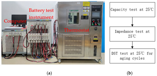 The experimental data used in this paper are obtained on an experimental platform with high-precision sensors. As shown in Figure 4a, the battery test bench consists of a battery test instrument with eight independent channels, a thermal chamber, and a hosting computer. Figure 4b illustrates the battery test projects, including the characterization test and aging test. Their loading profiles are displayed in Figure 5.