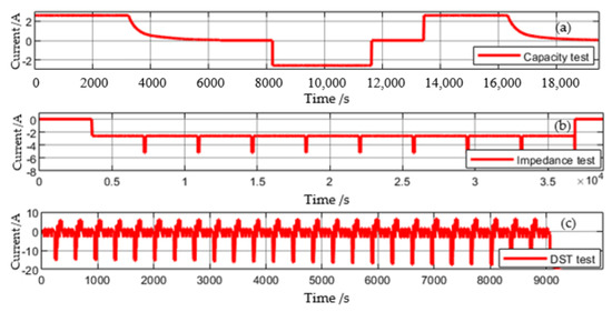 Current profiles: (a) Capacity test, (b) Impedance test, (c) DST test.