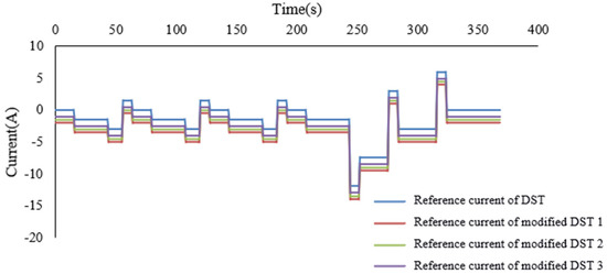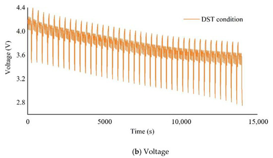 Based on the Dynamic Stress Test (DST) in the USABC Electric Vehicle Battery Test Manual, the experiment will be modified to simulate the load changes of pure electric vehicles due to road conditions and traffic situations. As shown in Figure 6, based on the characteristics of the driving conditions of pure electric vehicles, three different modifications are made based on the DST standard test. A complete discharge cycle of the battery will be accomplished alternately by four different discharge standards in the figure until the energy is exhausted. The battery voltage, current and discharge energy will be recorded during the experiment. A number of batteries with different degrees of aging are used to verify the accuracy of the proposed estimation method. The current and voltage of the battery under DST cycles as shown in Figure 7.