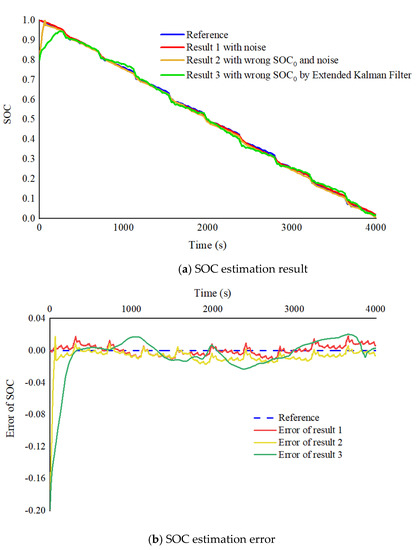 The battery model described in Equation (2) uses the least−squares method for parameter identification. The results are shown in Table 3. The reference SOC is also calculated based on the experimental data using the Coulomb counting method. In order to be able to verify the performance of the proposed algorithm, the simulation also simulates the effects of actual conditions including sensing noise, drift current, and unknown capacity.