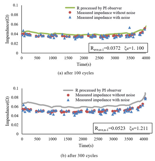 To improve the accuracy and reliability of the SOC estimation for the real engineering problem, a two-stage PI observer method is used to estimate the impedance and SOC of lithium-ion batteries. The integrator of the PI observer can give the observer better robustness in modeling uncertainty. It can improve the accuracy by suppressing the system interference and speed up the computation efficiency of the SOC estimation [22]. It is well known that the capacity and impedance change with battery aging, which further affects the estimation results of SOC. Thus, the online calculated dynamic impedance can be used to initially determine the status of battery usage. A compensation factor is added to modify the impedance of the observer model, which is used to account for the effect of battery aging. It is derived from the average dynamic impedance during the last discharge cycle of batteries and used to compensate for part of the system error due to the attenuation capacity during the current discharge cycle. Thus, the method can automatically match the PI observer at different battery capacities or other conditions by the influence of the factor above, instead of modifying the parameters of the PI observer itself. Comparing with the method based on several observers such as a sliding mode observer [20] and a dual-circuit observer [23], the PI observer is fast and accurate. Although the sliding mode observer is easy to design, it may encounter the problems of large chatting effect and poor tracking performance, while the double-loop observer has lower complexity but lower accuracy. The proposed observer can improve the estimation performance in different usage of the battery while ensuring a simple calculation.